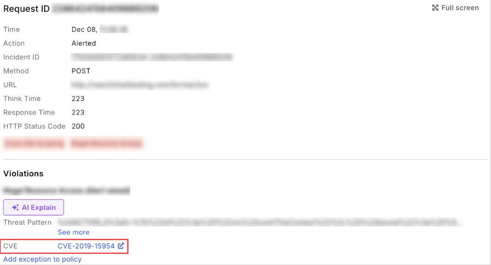 ทางทีม I-SECURE ลองทดสอบอีกครั้ง โดยการนำ Public Exploit ที่มีการแก้ไข Payload บางส่วน พบว่า Exploit ยังถูกตรวจจับได้จากอุปกรณ์ WAF แต่กลับถูกตรวจจับได้จาก WAF Signature ที่ถูกพบตั้งแต่ปี 2019 (อาจจะเกิดจากการที่มี Payload ของการโจมตีบางส่วนที่คล้ายกันกับช่องโหว่ของปี 2019) ซึ่งหมายความว่าหากแฮ็กเกอร์ที่มีความสามารถสูง ทำการเปลี่ยนแปลง Payload บางอย่าง ก็อาจจะสามารถ Bypass การป้องกันของ WAF ได้