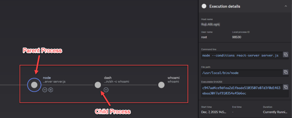 ทางทีม I-SECURE ทดสอบต่อไปโดยการเรียกใช้คำสั่งบนระบบภายหลังจากการ Exploit สำเร็จ เพื่อดูพฤติกรรมที่เกิดขึ้นบน Crowdstrike EDR ที่อยู่บน Server โดยพบว่า EDR มีข้อมูล Telemetry Process จากการเรียกใช้คำสั่งที่เกิดขึ้นภายหลังจากที่การโจมตีสำเร็จ โดยจะพบรายละเอียดของ Process Tree ดังนี้: