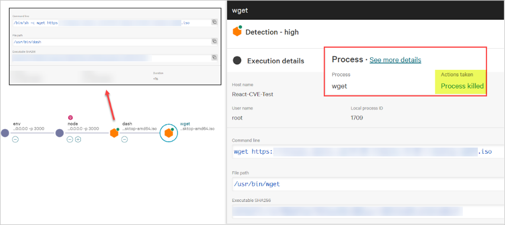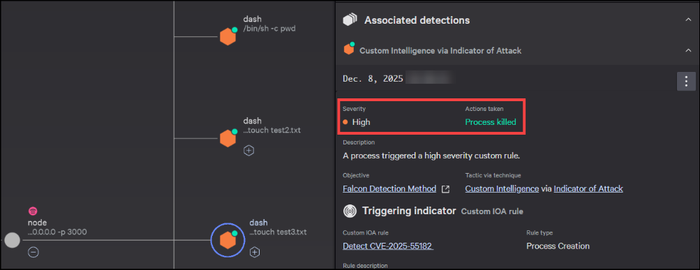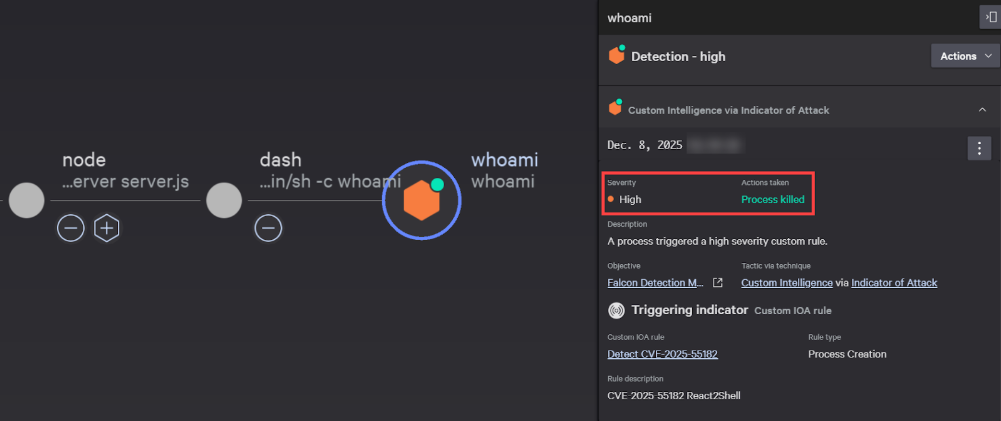 ซึ่งพบว่าภายหลังจากทดสอบการเรียกใช้คำสั่งบน Server อีกรอบ Crowdstrike EDR สามารถป้องกันการเรียกใช้คำสั่งที่เป็นผลมาจากการโจมตีแบบ React2Shell ได้