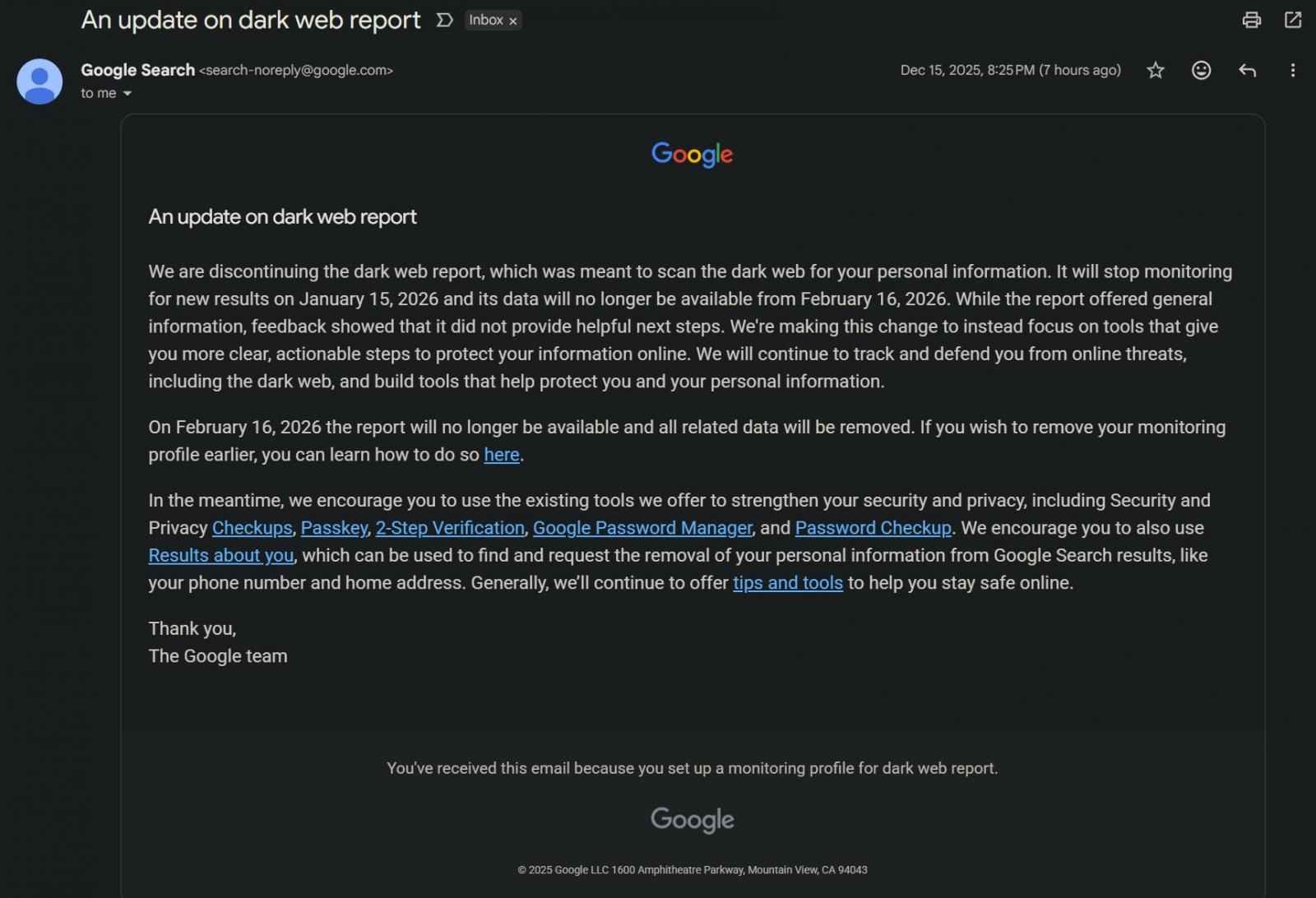 จากอีเมลที่ทาง BleepingComputer ได้รับการยืนยัน Google ระบุว่าจะยุติการตรวจสอบผลลัพธ์ใหม่ ๆ จาก Dark Web ในวันที่ 15 มกราคม 2026 และข้อมูลเดิมจะไม่สามารถเข้าถึงได้อีกต่อไปตั้งแต่วันที่ 16 กุมภาพันธ์ 2026 เป็นต้นไป