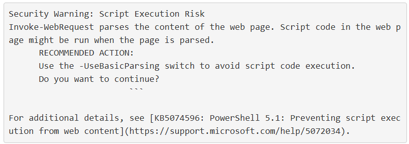 Microsoft ได้ปรับเปลี่ยนการทำงานโดยจะแสดงข้อความเตือนเมื่อ PowerShell มีการใช้คำสั่ง 'Invoke-WebRequest' เพื่อแนะนำให้ผู้ใช้เติมพารามิเตอร์ -UseBasicParsing เข้าไปเพื่อป้องกันการเรียกใช้โค้ด
