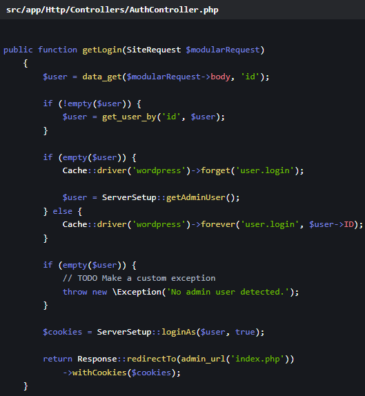 Patchstack อธิบายว่า “ในส่วนของ Controller ที่ไฟล์ src/app/Http/Controllers/AuthController.php ตรงเมธอด getLogin(SiteRequest $modularRequest) นั้น ตัวโค้ดจะพยายามอ่านค่า User ID ออกมาจากส่วน Body ของ $modularRequest”