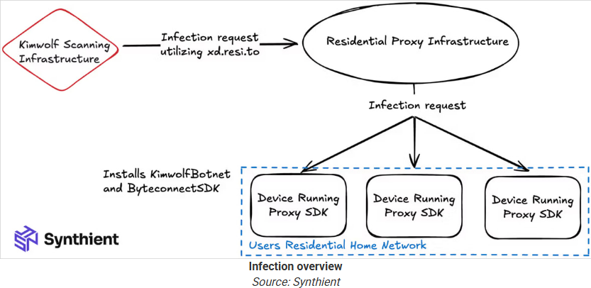 จากข้อมูลของ Synthient การเติบโตอย่างรวดเร็วของ Kimwolf ส่วนใหญ่เกิดจากการใช้เครือข่าย residential proxy เพื่อเข้าถึงอุปกรณ์แอนดรอยด์ที่มีความเสี่ยง โดยเฉพาะอย่างยิ่ง มัลแวร์นี้ใช้ประโยชน์จากผู้ให้บริการพร็อกซีที่อนุญาตให้เข้าถึง local network addresses และพอร์ตภายใน ทำให้สามารถโต้ตอบโดยตรงกับอุปกรณ์ที่ทำงานบนเครือข่ายภายในเดียวกันกับไคลเอ็นต์พร็อกซีได้