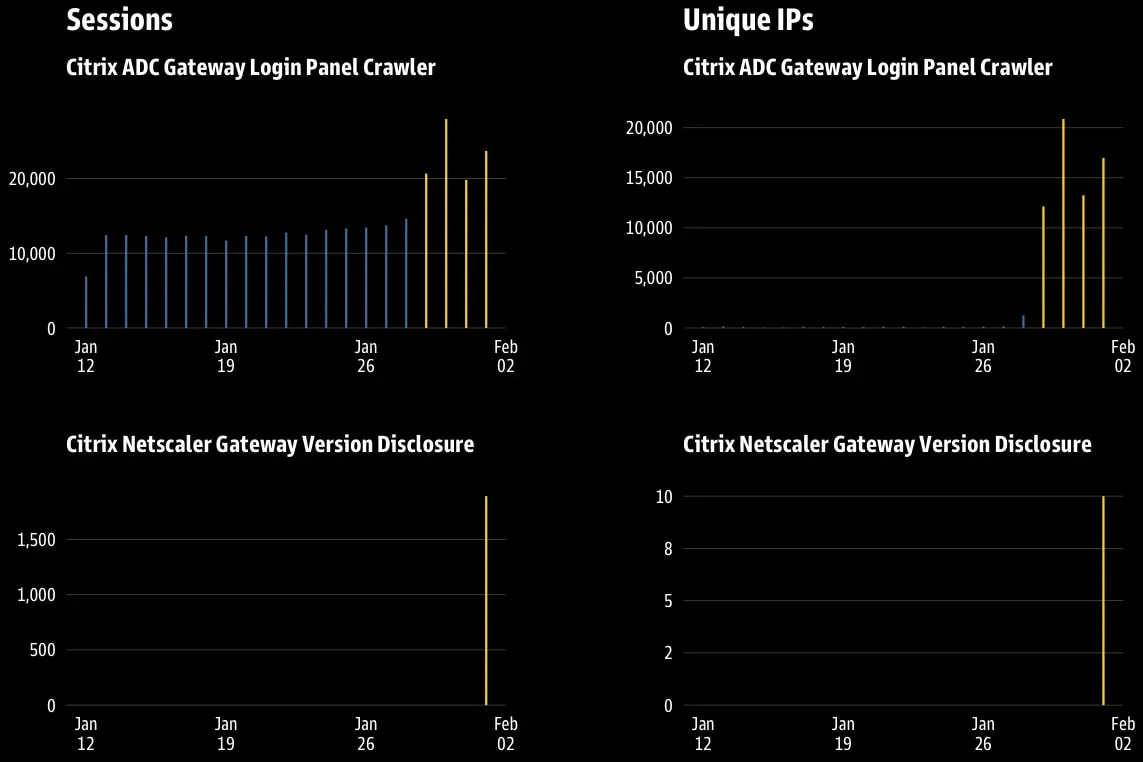 GreyNoise ซึ่งเป็น Threat monitoring platform ได้ติดตามแหล่งที่มาของทราฟฟิกการสแกนไปยัง IP ที่แตกต่างกันมากกว่า 63,000 รายการ ซึ่งเปิดใช้งาน 111,834 เซสชัน ตามที่นักวิจัยระบุ 79% ของทราฟฟิกมุ่งเป้าไปที่ Citrix Gateway Honeypots