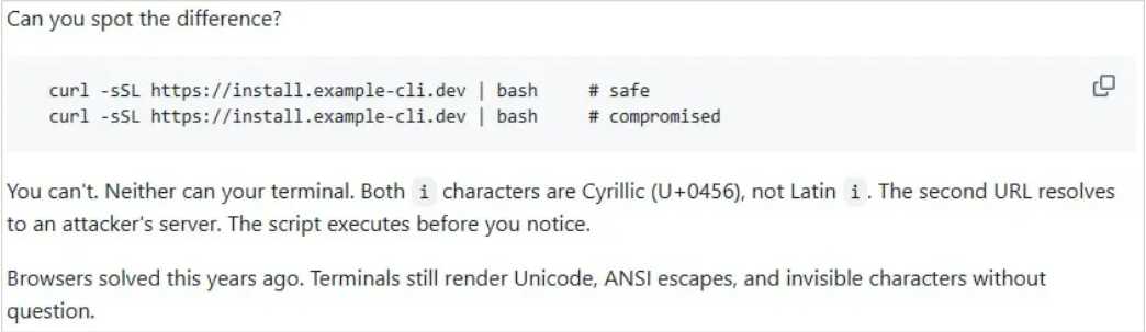 ตัวอักษรเหล่านี้ และตัวอักษรที่ซ่อนอยู่ในคำสั่ง พบได้บ่อยมากในการโจมตีแบบ ClickFix ซึ่งถูกใช้โดยอาชญากรไซเบอร์หลายกลุ่ม ดังนั้น Tirith จึงสามารถช่วยป้องกันการโจมตีเหล่านี้ได้ในระดับหนึ่งบนเซสชันของ PowerShell ที่รองรับได้