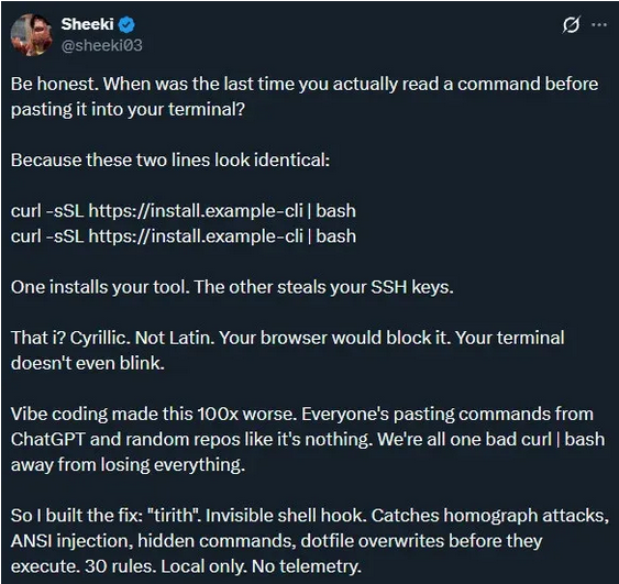 เครื่องมือโอเพนซอร์ส และใช้งานได้หลายแพลตฟอร์มตัวใหม่ที่ชื่อว่า Tirith สามารถตรวจจับการโจมตีแบบ Homoglyph ใน environments แบบ Command-line โดยตัวเครื่องมือจะวิเคราะห์ URL ในคำสั่งที่พิมพ์ลงไป และสั่งระงับการทำงานหากพบความผิดปกติ