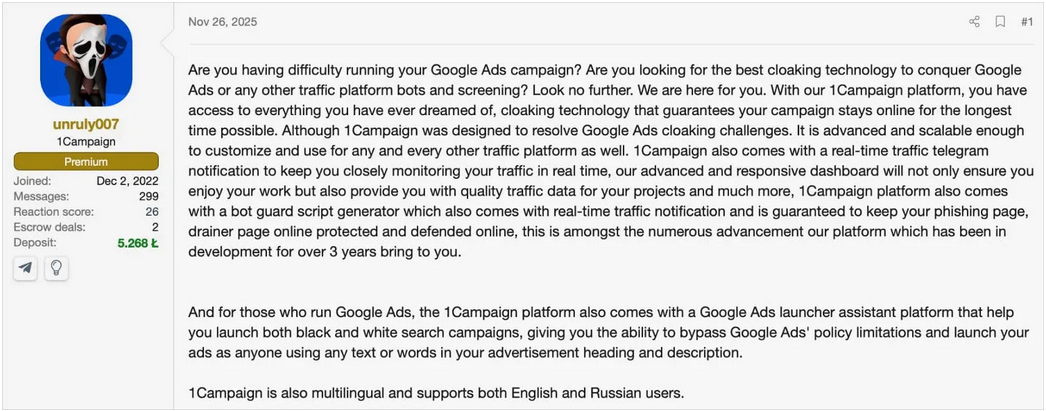 1Campaign คือ Cloaking service ที่ทำให้โฆษณาสามารถผ่านกระบวนการคัดกรองของ Google มาได้ โดยระบบจะแสดงเนื้อหาที่เป็นอันตรายให้เฉพาะกับเหยื่อที่เป็นคนจริงเท่านั้น ในขณะที่นักวิจัยด้านความปลอดภัย หรือระบบสแกนอัตโนมัติจะถูกหลอกให้เห็นเพียงหน้า White pages ที่ไม่เป็นอันตราย