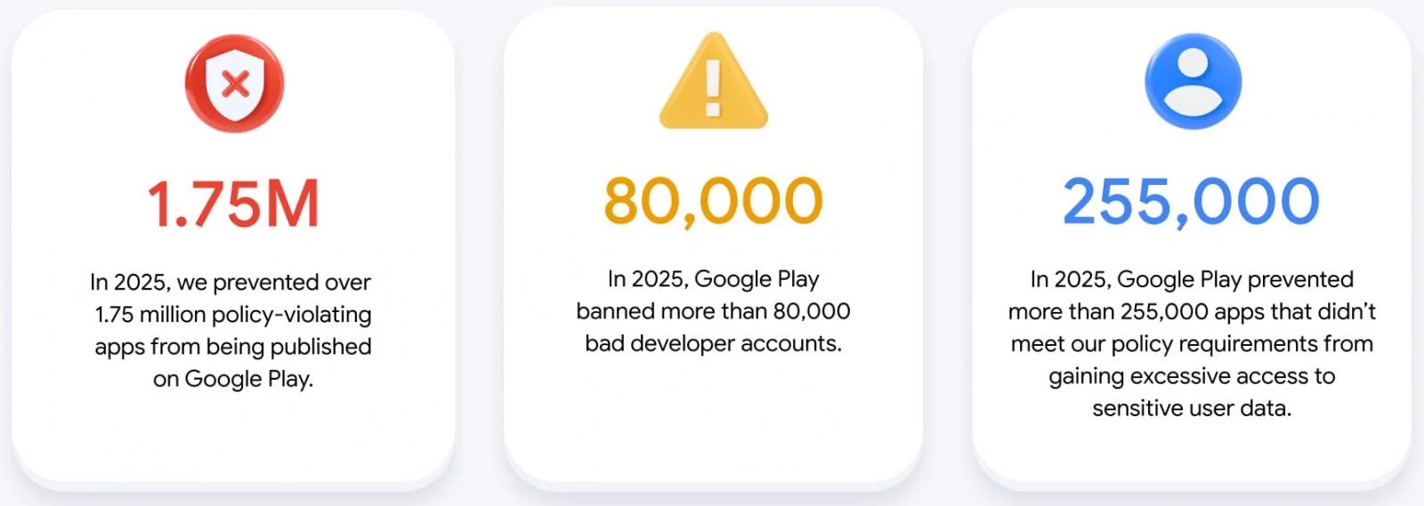 สำหรับข้อมูลการป้องกันผู้ใช้งานในปีที่ผ่านมา ได้แก่ การระงับบัญชีนักพัฒนาที่มีพฤติกรรมไม่เหมาะสมมากกว่า 80,000 บัญชี การตรวจพบแอปพลิเคชันที่ละเมิดนโยบายมากกว่า 1.75 ล้านรายการ และการปฏิเสธไม่ให้แอปฯ เข้าถึงข้อมูลผู้ใช้ที่มีความสำคัญมากกว่า 255,000 รายการ