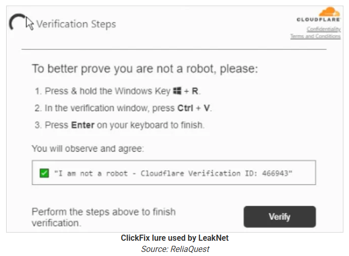 กลุ่ม LeakNet ransomware กำลังใช้เทคนิค ClickFix เพื่อข้าสู่ระบบเครือข่ายขององค์กร และใช้ loader มัลแวร์ที่พัฒนาขึ้นจาก Deno ซึ่งเป็น Open-source runtime สำหรับ JavaScript และ TypeScript โดยผู้โจมตีใช้ Deno ที่ถูกต้องในการถอดรหัส และเรียกใช้เพย์โหลดโดยตรงไปยัง memory ของระบบ เพื่อทำลายหลักฐานบนดิสก์ และหลีกเลี่ยงการตรวจจับ