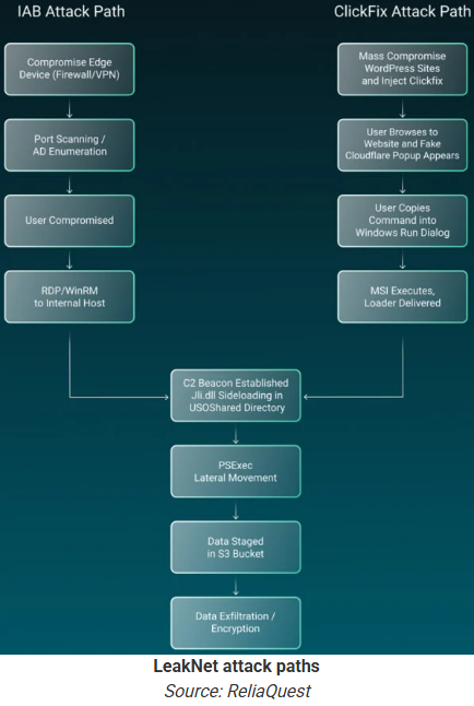ในขั้นตอนหลังการโจมตี กลุ่ม LeakNet จะใช้การโหลด DLL (jli.dll โหลดผ่าน Java ใน C:\ProgramData\USOShared), การส่งสัญญาณกลับไปยัง C2, การค้นหาข้อมูล Credentials ผ่านการใช้คำสั่ง 'klist', การแพร่กระจายไปยังเครื่องอื่น ๆ ในเครือข่ายผ่าน PsExec, การจัดเตรียมไฟล์อันตราย และการขโมยข้อมูล รวมถึงการใช้งาน Amazon S3 buckets ในทางที่ผิด