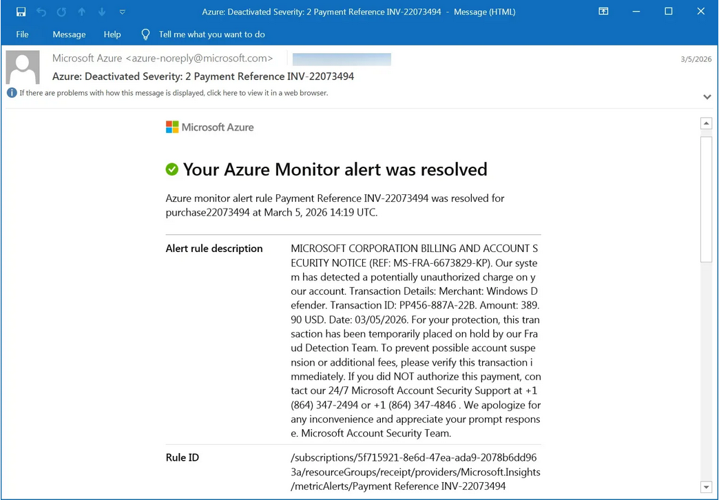ในช่วงเดือนที่ผ่านมา มีรายงานจากผู้ใช้จำนวนมากว่าได้รับข้อความแจ้งเตือนจาก Azure Monitor เกี่ยวกับการเรียกเก็บเงินที่น่าสงสัย หรือความผิดปกติในใบแจ้งหนี้ของบัญชี โดยในข้อความมีการให้ผู้รับโทรติดต่อไปยังหมายเลขโทรศัพท์ที่แนบมาในอีเมลดังกล่าว