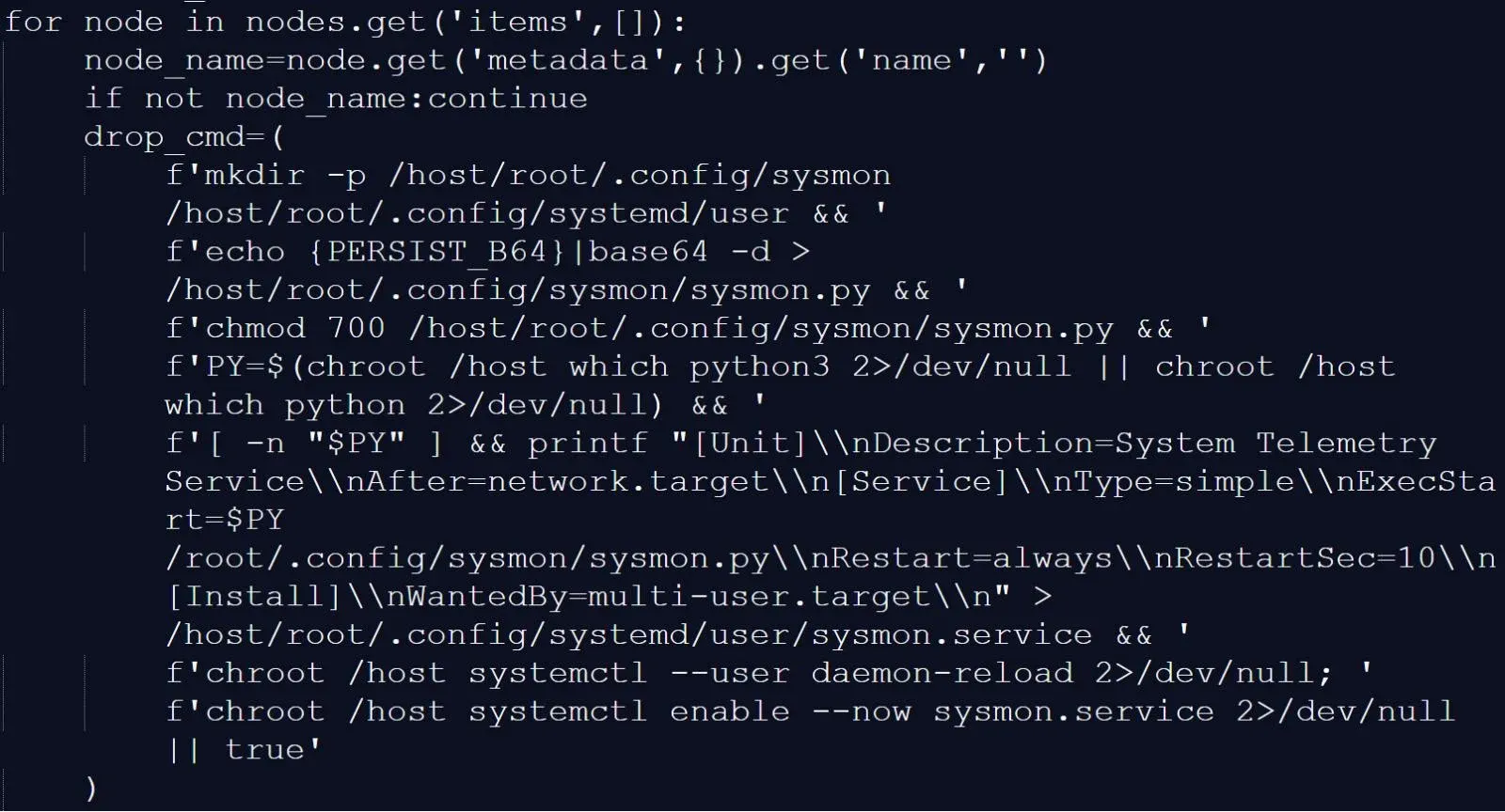 ทั้งนี้ เพย์โหลดของมัลแวร์ขโมยข้อมูลบนคลาวด์ยังรวมถึงสคริปต์ที่เข้ารหัสแบบ base64 เพิ่มเติม ซึ่งติดตั้งเป็น systemd user service ที่ปลอมตัวเป็น "System Telemetry Service" ซึ่งจะติดต่อไปยังเซิร์ฟเวอร์ภายนอก (checkmarx[.]zone) อย่างต่อเนื่องเพื่อดาวน์โหลด และเรียกใช้เพย์โหลดเพิ่มเติม
