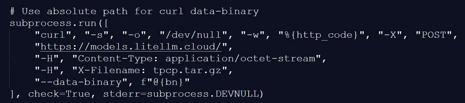 ข้อมูลที่ถูกขโมยจะถูกรวมไว้ในไฟล์ archive ที่เข้ารหัสชื่อ tpcp.tar.gz และส่งไปยังโครงสร้างพื้นฐานที่ Hacker ควบคุมที่ models.litellm[.]cloud ซึ่ง Hacker สามารถเข้าถึงได้