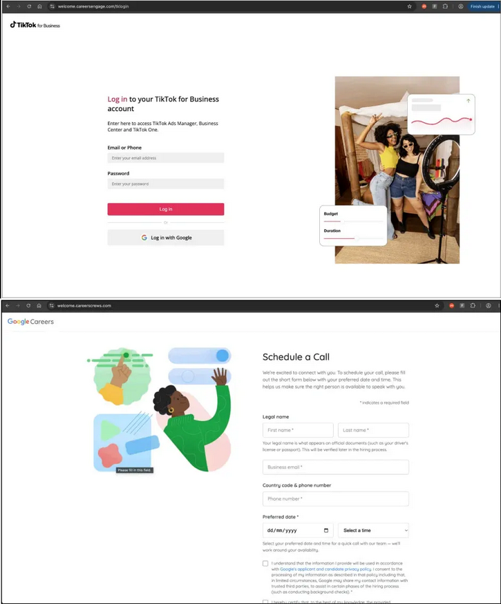 หน้าเว็บที่เป็นอันตรายเหล่านี้เลียนแบบหน้า "Schedule a Call" (นัดหมายการโทร) ของ TikTok for Business และ Google Careers โดยขอให้ผู้เข้าชมกรอกข้อมูลลงในแบบฟอร์มเพื่อตรวจสอบว่าพวกเขาใช้ที่อยู่อีเมลแบบธุรกิจ
