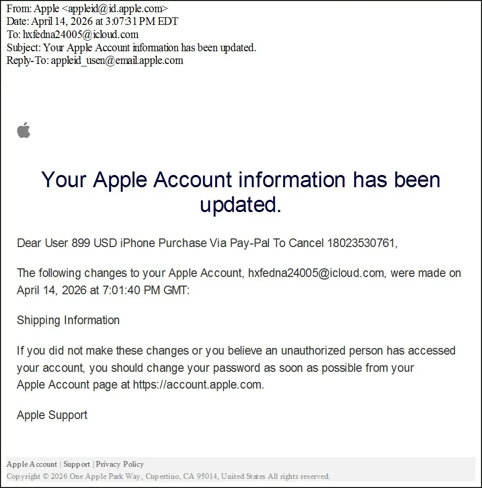 "การเปลี่ยนแปลงต่อไปนี้ในบัญชี Apple ของคุณ hxfedna24005[@]icloud[.]com ได้ดำเนินการเมื่อวันที่ 14 เมษายน 2026 เวลา 19:01:40 น. GMT:"