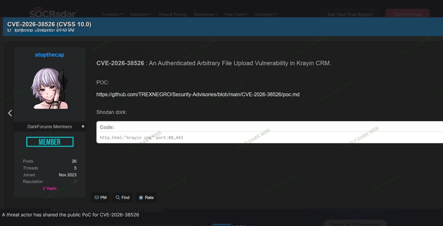 นอกจากนี้ยังพบการเคลื่อนไหวใน Dark Web ที่มีการแจกจ่ายลิงก์ Exploit พร้อมกับ Shodan Dork (http.html:"krayin crm" port:80,443) เพื่อสแกนหาอินสแตนซ์ (Instance) ของ Krayin CRM ที่ออนไลน์อยู่ทั่วโลก ซึ่งถือเป็นสัญญาณบ่งชี้ชัดเจนถึงการเตรียมการโจมตีในอนาคต
