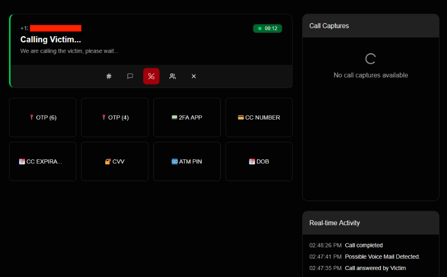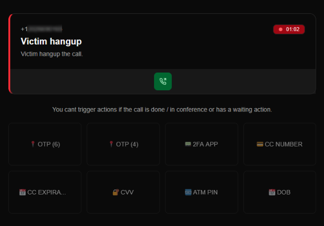 บนแผงควบคุมจะแสดงแถบสถานะการทำงานพร้อมหมายเลขโทรศัพท์เป้าหมาย และตัวจับเวลาที่กำลังเดินอยู่ ส่วนด้านล่างคือ Action Grid หรือแผงคำสั่งหลัก 8 ชุดข้อมูลที่มิจฉาชีพต้องการดักจับ ได้แก่: รหัส OTP (6 หลัก), รหัส OTP (4 หลัก), 2FA, หมายเลขหน้าบัตรเครดิต, วันหมดอายุของบัตร, รหัส CVV, รหัส ATM และข้อมูลวันเดือนปีเกิด