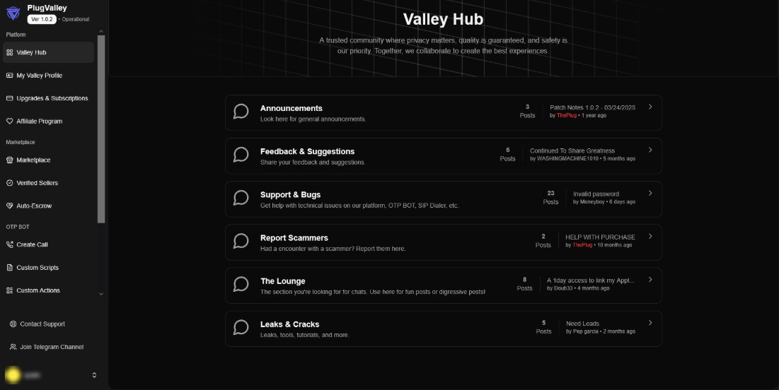 แถบเมนูด้านซ้ายแสดงขอบเขตการทำงานไว้อย่างครบวงจร ครอบคลุมตั้งแต่ส่วนงาน Community, ตลาดซื้อขาย, รายชื่อผู้ขายที่ผ่านการรับรอง, ระบบคนกลางอัตโนมัติ (Auto-escrow) ไปจนถึงโปรแกรมพันธมิตร (Affiliate) และภายใต้เมนู OTP Bot จะประกอบด้วยส่วนการสร้างคำสั่งโทร, การปรับแต่งสคริปต์ และการตั้งค่าระบบตามความต้องการของผู้ใช้งาน ซึ่งทั้งหมดนี้คือโครงสร้างพื้นฐานที่ถูกออกแบบมาเพื่อสนับสนุนการโจมตีโดยเฉพาะ