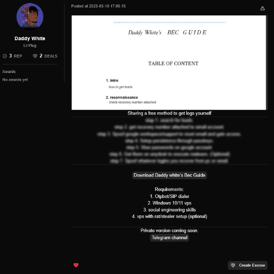 นอกจากนี้ แพลตฟอร์มยังมีเนื้อหาให้ความรู้เพื่อช่วยลดช่องว่างด้านทักษะของมิจฉาชีพ โดยมีโพสต์จากผู้ใช้งานรายหนึ่งที่แจกคู่มือการทำ BEC (Business Email Compromise) ซึ่งครอบคลุมตั้งแต่กระบวนการระบุเป้าหมาย, การตรวจสอบหมายเลขโทรศัพท์สำหรับกู้คืนบัญชีอีเมลที่ถูกเจาะระบบ, การคงสถานะการเข้าถึงระบบ (Persistence) ไปจนถึงวิธีการขยายผลการโจมตีเข้าสู่โครงสร้างระบบหลักหลังจากดักจับรหัสผ่านสำเร็จ สำหรับอุปกรณ์ และทักษะที่ระบุว่าจำเป็นต้องใช้ ได้แก่ OTP Bot, ระบบโทรศัพท์ผ่านเครือข่ายอินเทอร์เน็ต (SIP Dialer), เซิร์ฟเวอร์ Windows VPS, ทักษะ Social Engineering และอาจมีการใช้มัลแวร์ประเภท RAT หรือ Stealer ร่วมด้วย ทั้งนี้ยังมีการระบุทิ้งท้ายว่าคู่มือฉบับเจาะลึกกำลังจะถูกเผยแพร่ในเร็ว ๆ นี้