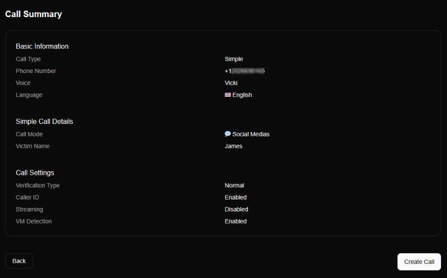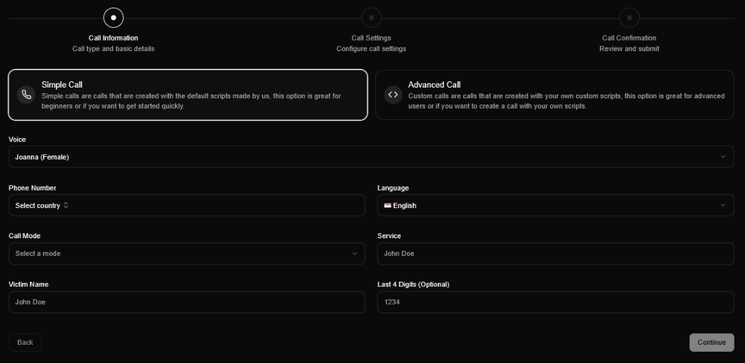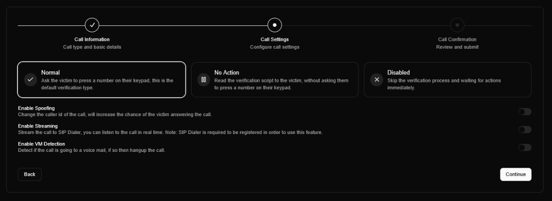 ขั้นตอนที่สองคือ การกำหนดค่าของการโทร โดยผู้ควบคุมต้องเลือกรูปแบบการโต้ตอบ ซึ่งประกอบด้วย: โหมด Normal ที่ระบบจะรอให้เหยื่อกดปุ่มบนโทรศัพท์ก่อนดำเนินการสนทนาต่อ, โหมด No Action ที่บอทจะดำเนินการอ่านสคริปต์อย่างต่อเนื่องโดยไม่รอการตอบสนอง และโหมด Disabled สำหรับข้ามขั้นตอนการยืนยันทั้งหมด นอกจากนี้ยังมีส่วนการตั้งค่าเสริมอีก 3 ฟังก์ชันหลัก ได้แก่ การปลอมแปลงหมายเลขโทรศัพท์ (Caller ID Spoofing), การเชื่อมต่อสายผ่านระบบ SIP (SIP Streaming) และระบบตรวจจับกล่องรับฝากข้อความ (Voicemail Detection)