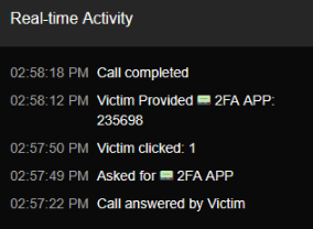 เพียง 27 วินาที หลังจากเหยื่อรับสาย ผู้ควบคุมระบบได้ส่งคำสั่งเพื่อขอรหัส 2FA ในทันที และใช้เวลาเพียง 1 วินาที หลังจากนั้นในการรอให้เหยื่อตอบรับด้วยการกดหมายเลข '1' ตามด้วยอีก 22 วินาที สำหรับการดักจับรหัสที่เหยื่อแจ้งออกมา และสิ้นสุดกระบวนการด้วยการตัดสายภายใน 6 วินาที โดยภาพรวมแล้ว ปฏิบัติการทั้งหมดนี้เสร็จสิ้นภายในระยะเวลาเพียง 56 วินาที เท่านั้นข้อมูลจะถูกดักจับ และแสดงผลบนหน้าจอ 'Call Captures' ในทันทีที่สิ้นสุดการสนทนาของเป้าหมาย