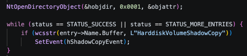 ก่อนเริ่มการโจมตี ระบบจะสร้าง Background Thread เพื่อเปิด NT Object Manager ใน Path \Device และทำการบันทึกข้อมูล (Snapshot) ของอุปกรณ์ HarddiskVolumeShadowCopy* ทั้งหมดที่มีอยู่ในขณะนั้น