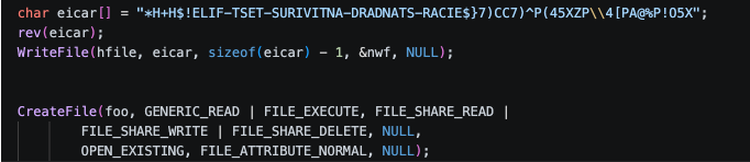 ข้อความทดสอบมาตรฐานอย่าง EICAR จะถูกจัดเก็บแบบ Reversed ไว้ภายในตัวไฟล์ Binary เพื่อหลีกเลี่ยงการตรวจจับแบบ Static Analysis เมื่อเริ่มทำงาน สตริงดังกล่าวจะถูก Reversed ในหน่วยความจำ และเขียนลงในไฟล์ชั่วคราวชื่อ TieringEngineService.exe ภายใต้ Path %TEMP%