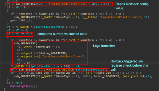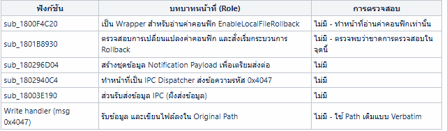 ค่าคอนฟิก EnableLocalFileRollback จะถูกอ่าน และนำมาเปรียบเทียบกับสถานะที่บันทึกไว้ใน Cache เมื่อพบว่ามีการเปลี่ยนแปลงสถานะ ระบบจะส่งคำสั่ง Rollback ออกไปทันที โดยทำการส่งค่า Original Detection Path (เส้นทางเดิมที่ตรวจพบไฟล์อันตราย) ลงไปยังขั้นตอนถัดไปของกระบวนการ