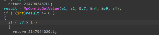ฟังก์ชันนี้เป็นเพียง Wrapper มาตรฐานสำหรับเรียกใช้งาน MpConfigGetValue API (ซึ่งถูกส่งออกมาจาก MpClient.dll) โดยมันมีหน้าที่อ่านค่าคอนฟิกแบบ DWORD และไม่มีผลข้างเคียง (Side Effect) ใด ๆ ต่อระบบ