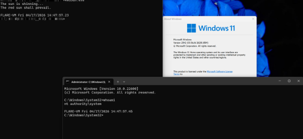 เนื่องจากไฟล์ดังกล่าวถูกแทนที่ด้วย Payload ของผู้โจมตีไปแล้ว มันจึงถูกรันขึ้นภายใต้สิทธิ์ SYSTEM ทันที โดย Payload จะตรวจสอบบริบทการทำงาน ผ่านฟังก์ชัน IsRunningAsLocalSystem() จากนั้นจะอ่านค่า Session ID ของผู้ใช้จาก Named Pipe (\\.\pipe\REDSUN) เพื่อทำการรัน conhost.exe ขึ้นมาใน Session ปัจจุบัน และมอบสิทธิ์การควบคุม Command Prompt ให้กับผู้โจมตีโดยสมบูรณ์